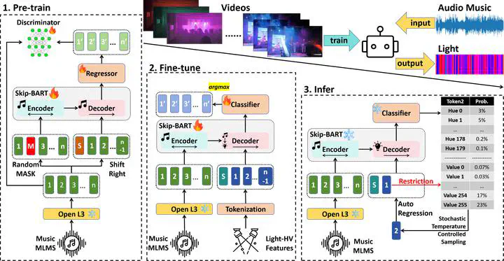 Stage lighting is a vital component in live music performances, shaping an engaging experience for both musicians and audiences. In recent years, Automatic Stage Lighting Control (ASLC) has attracted growing interest due to the high costs of hiring or training professional lighting engineers. However, most existing ASLC solutions only classify music into limited categories and map them to predefined light patterns, resulting in formulaic and monotonous outcomes that lack rationality. To address this gap, this paper presents Skip-BART, an end-to-end model that directly learns from experienced lighting engineers and predict vivid, human-like stage lighting. To the best of our knowledge, this is the first work to conceptualize ASLC as a generative task rather than merely a classification problem. Our method adapts the BART model to take audio music as input and produce light hue and value (intensity) as output, incorporating a novel skip connection mechanism to enhance the relationship between music and light within the frame grid. To address the lack of available datasets, we create the first stage lighting dataset, along with several pre-training and transfer learning techniques to improve model training with limited data. We validate our method through both quantitative analysis and an human evaluation, demonstrating that Skip-BART outperforms conventional rule-based methods across all evaluation metrics and shows only a limited gap compared to real lighting engineers.
